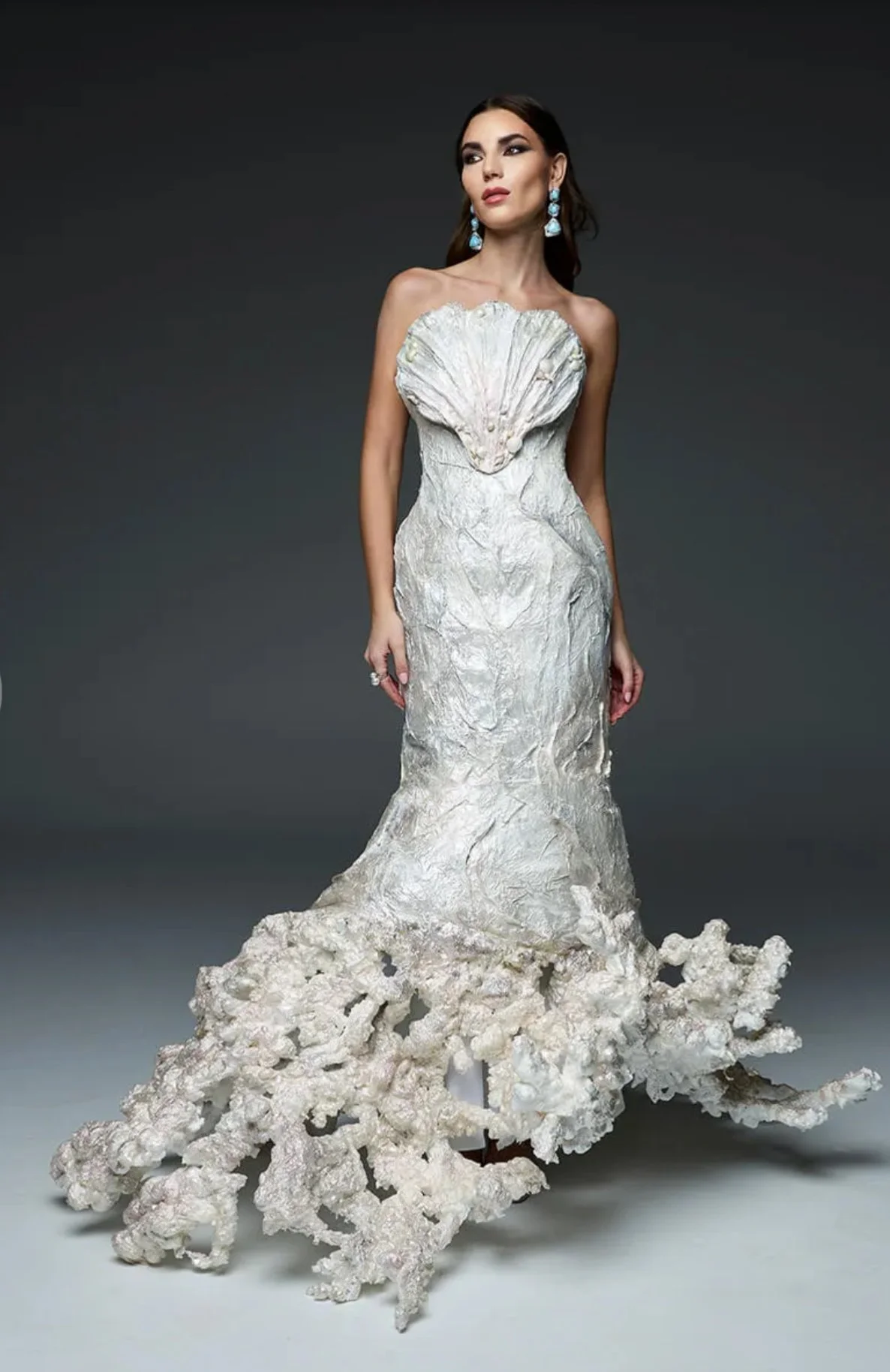 Cette robe unique, entièrement confectionnée en papier hygiénique Cashmere, a été imaginée comme une œuvre sculpturale portant un message fort. Inspirée de la Gaspésie et de l’univers marin, elle évoque une femme mi-sirène, mi-corail, surgissant des fonds marins. Ses volumes organiques rappellent les formes naturelles des récifs, tandis que sa légèreté traduit le mouvement fluide de l’eau.